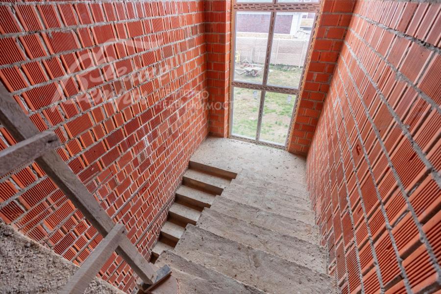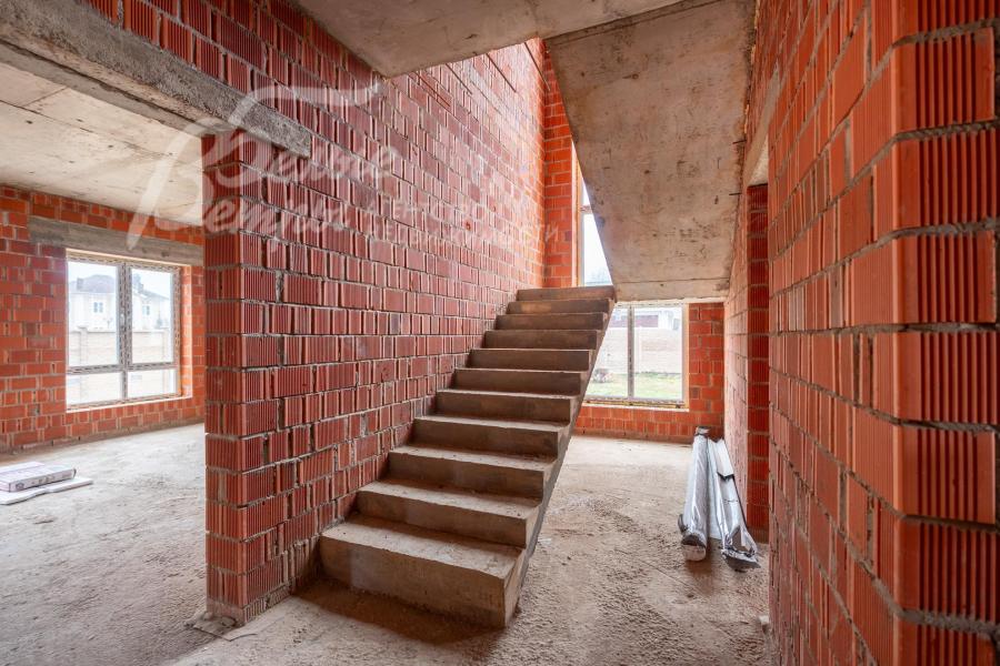 Описание внутренней отделки: дом под отделку – можно реализовать авторский проект интерьера. Возведены стены, установлены окна. На второй этаж ведёт лестница на бетонном основании